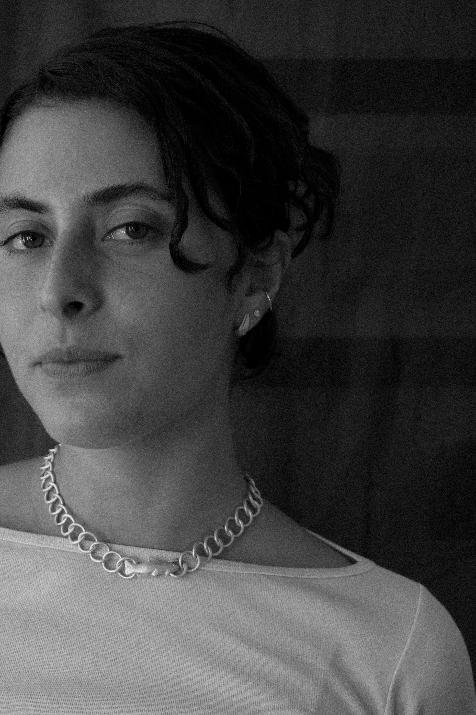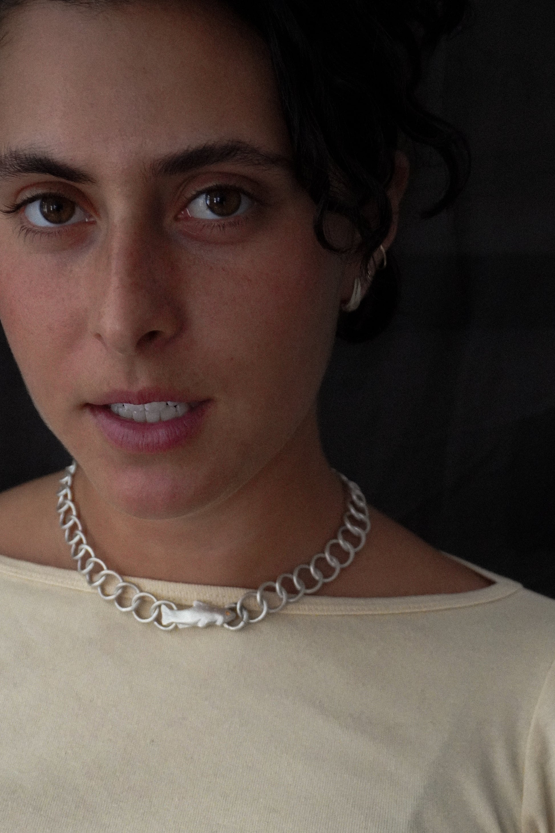 A freshwater species as the catch on a hand fabricated curb chain, with twinkling sapphire eyes.
